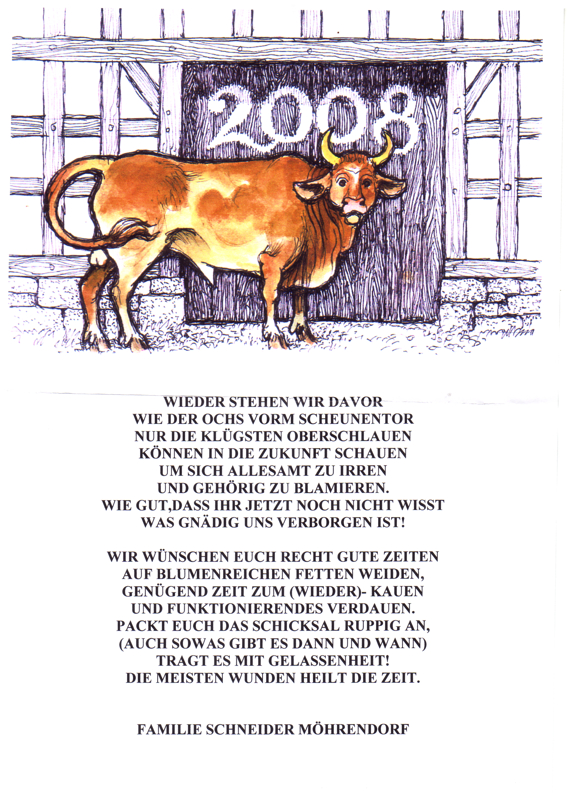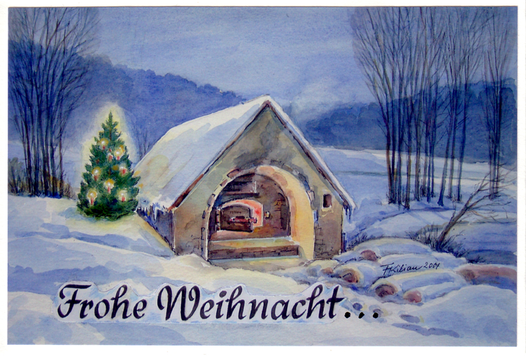Eigentlich beschreibt er mit Wort und Bild doch recht zutreffend, der Oberstudienrat u. Kunstmaler Gerhard Schneider aus Möhrendorf bei Erlangen. Oder? Von ihm erhielten wir obige "Geißelung", leicht witzig-ironisch Mut machend. Ziemlich entspannt sieht Felix Kilian aus Nürnberg - er gestaltete vor Jahren die Grafik zu den Sammler-Krügen des Förderverein Burgruine Lichtenegg - hingegen die Welt. Sein von ihm gemalter Lichtenegger Backofen" vermittelt trotz oder gerade der Winterlandschaft wegen, Wärme, Ruhe, Innehalten. Vielen Dank den beiden Künstlern! | |