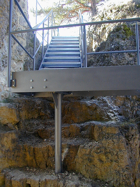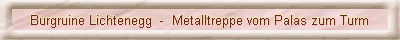Frühjahr/Sommer 2007 Mit einer neuen Metalltreppe innerhalb der Burganlage soll der Aufstieg zum Aussichtsplateau des Burgberggipfels sicherer gestaltet werden. Prima Idee. Die Besucher der Burgruine werden sich freuen. Als einer der Hauptinitiatoren und zugleich Sponsor gilt eine seit langen Jahren in Lichtenegg ansässige Unternehmerfamilie aus Nürnberg. Für August ist der Einbau vorgesehen. November 2007 Die neue Metalltreppe lagert dem Protokoll des Fördervereins vom 17.11.2007 zufolge seit einiger Zeit zur Montage bereit. Spendengelder sind en masse vorhanden ... Freude an der Heimat, am kleinen Dörfchen Lichtenegg und seiner Burgruine, in die Welt hinauszutragen, sehen wir als eine unserer Aufgaben. Um die Freude an der neuen Treppe möglichst bald kundtun zu können, mussten wir schon ein wenig auch öffentlichen Druck ausüben. Man verzeihe uns das. Das Ergebnis kann sich sehen lassen und dürfte nicht zuletzt auch im Interesse vieler nicht mit den örtlichen Internas vertrauter Mitglieder des Fördervereins Burgruine Lichtenegg sein. Ein herzliches Dankeschön an alle jene, die schließlich im wahrsten Sinne des Wortes den Weg frei machten für diese hochachtenswerte vernünftige Lösung! | |||||||||||||||||||||||||||||||||||||||||||||||||||||||||||||||||||||||||||||||||||||