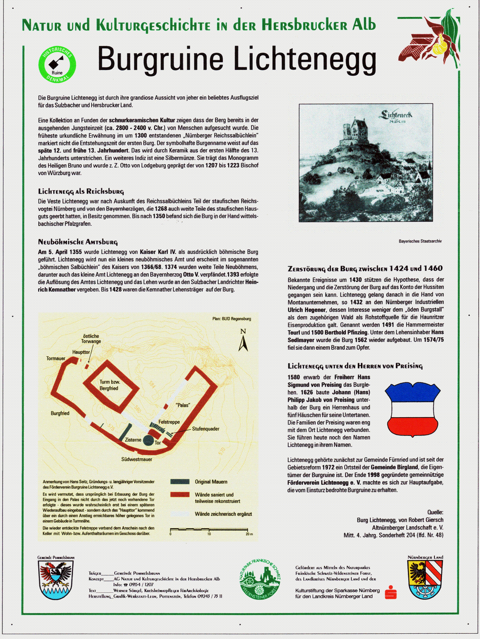 Die Infotafel auf der Burgruine Lichtenegg zählt zur Ausstellungsreihe "Natur- und Kulturgeschichte in der Hersbrucker Schweiz" der Gemeinde Pommelsbrunn. Die Lichtenegger Tafel wurde, gleich wie die anderen auf Pommelsbrunner Gebiet auch, aus Mitteln des Naturpark Fränkische Schweiz/ Veldensteiner Forst bezuschusst. Sie gibt in kurzer prägnannter Übersicht Auskunft zur Geschichte der ehemaligen Burg Lichtenegg. Der Entschluss zur Anfertigung auch der Lichtenegger Tafel wurde am 22.04.2002 im Gasthaus Vogel in Pommelsbrunn gefasst. Der damalige Bürgermeister Werner Oberleiter und der Pommelsbrunner Heimatvereinsvorsitzende Ulrich Vogel hatten zu der Besprechung auch den Lichtenegger Gastwirt Hans Raum eingeladen, der sich erfreut zeigte und Unterstützung für das Projekt zusagte. Maßgeblich beteiligt an der inhaltlichen und grafischen Gestaltung der Lichtenegger Infotafel waren neben den auf der Tafel genannten Personen, Hans Seitz, Hans Raum und Rolf Wolfermann. Die Einweihung fand am 12.06.2007 unter Teilnahme von Birgland Bürgermeister Herbert Steinmetz, Pommelsbrunns Bürgermeister Jörg Fritsch, Weigendorfs Bürgermeister Georg Schmid, Illschwangs 2. Bürgermeister Alfred Ebert und Florian Rieder, Geschäftsführer der Zukunftsagentur Plus, statt. Der Einladung von Hans Raum, der den Termin im Auftrag von Bürgermeister Steinmetz arrangiert hatte, gefolgt waren auch die Kreisheimatpfleger des Nürnberger Land Robert Giersch und Werner Sörgel, dazu der Gründungs- u. langjährige Vorsitzende des Förderverein Burgruine Lichtenegg. e.V., Hans Seitz sowie dessen Nachfolger Richard Pilhöfer. Dank gilt insbesondere auch Bürgermeister Herbert Steinmetz, der spontan die finanzielle Unterstützung der Gemeinde Birgland zur Anfertigung des Rahmengestells zugesagt hatte. | |||||||||||||||||||||||||||||||||||||||||||||||||||||||||||||||||||||||||